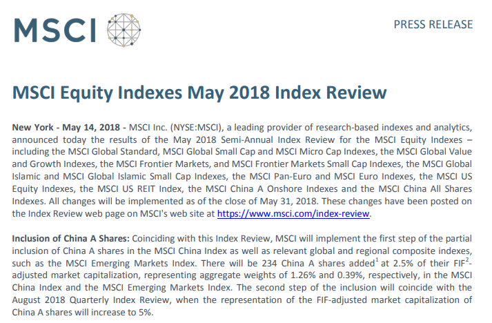 MSCI:234只A股被纳入MSCI指数体系 6月1日生效(附名单)